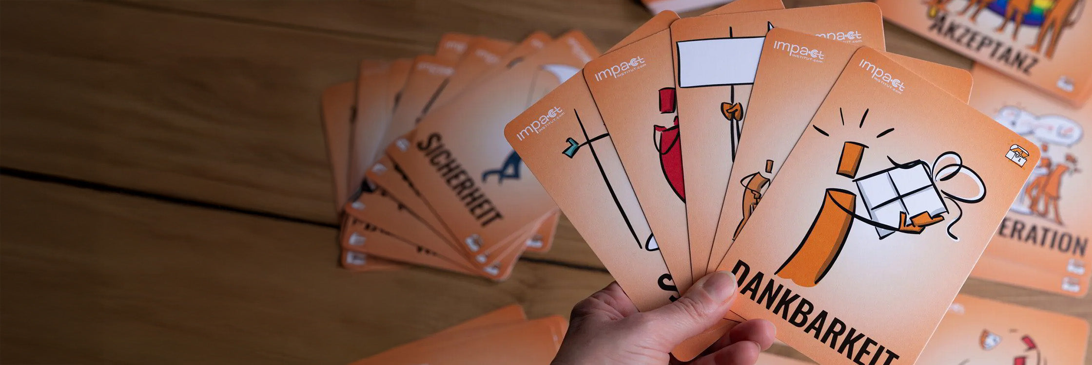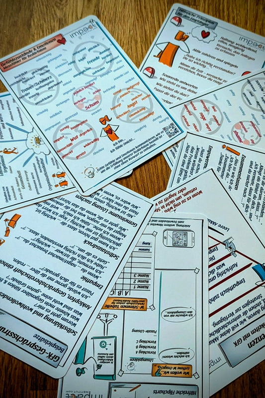 Im Impact Shop findest du sorgfältig entwickelte Arbeitsmaterialien für Coaching, Training und persönliche Entwicklung. Unsere Tools unterstützen dich dabei, Gespräche klarer, empathischer und wirkungsvoller zu gestalten – ob im beruflichen Kontext, im Team oder im privaten Alltag. Von Kommunikationskarten bis zu methodischen Arbeitssets: Alle Produkte sind praxisorientiert, leicht anwendbar und darauf ausgelegt, nachhaltige Veränderung zu ermöglichen.