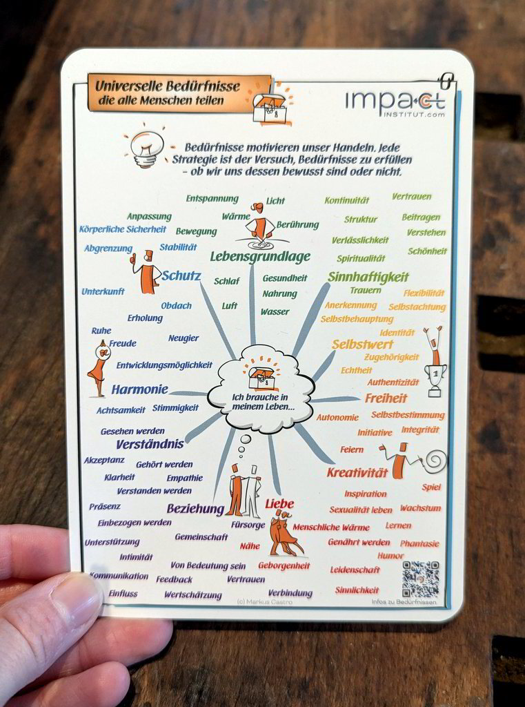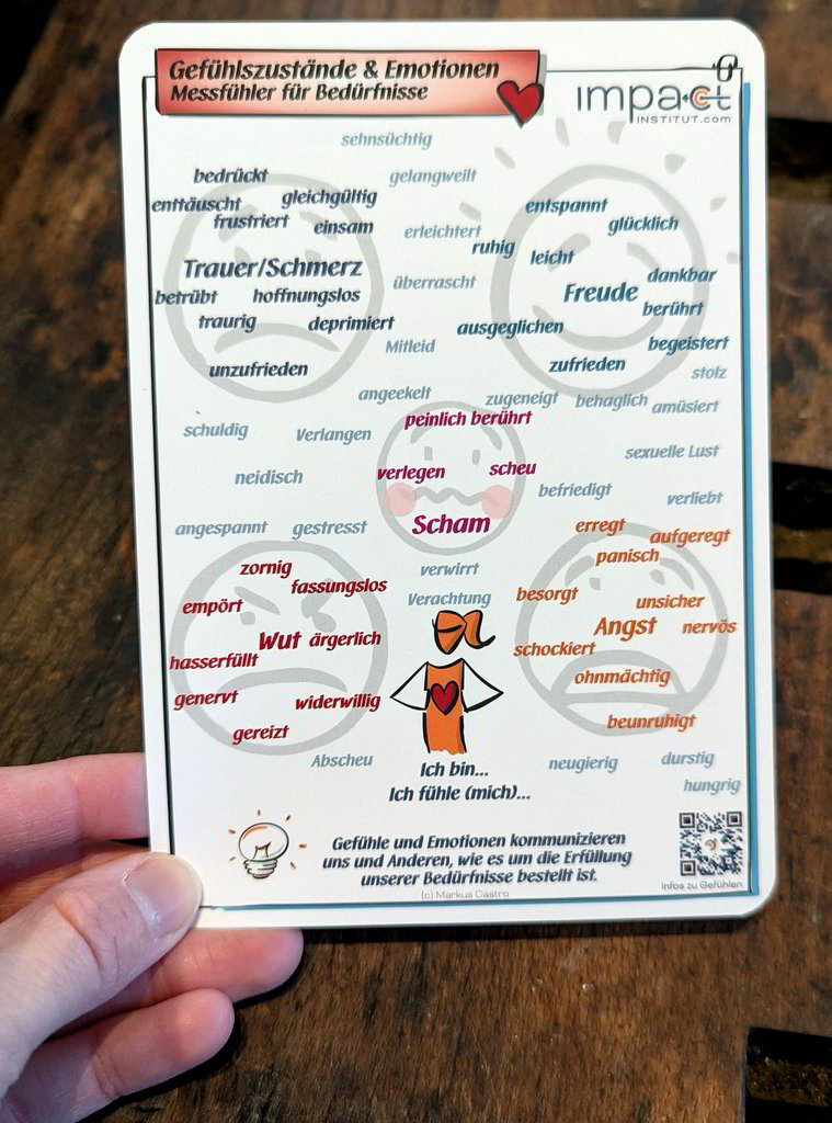 Diese Karte bietet eine kompakte Gesamtübersicht zentraler Gefühle und universeller Bedürfnisse der Gewaltfreien Kommunikation. Sie unterstützt dabei, innere Zustände einzuordnen und die Verbindung zwischen Gefühlen und unerfüllten oder erfüllten Bedürfnissen besser zu verstehen.