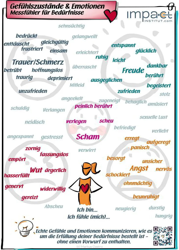 Für den Einsatz in Firmenseminaren braucht es andere Begriffe als die klassischen GFK-Bedürfnisse. Dafür haben wir dieses Plakat erstellt. Diese Übersicht über die wichtigsten Bedürfnisse ist thematisch gruppiert und liebevoll visualisiert.