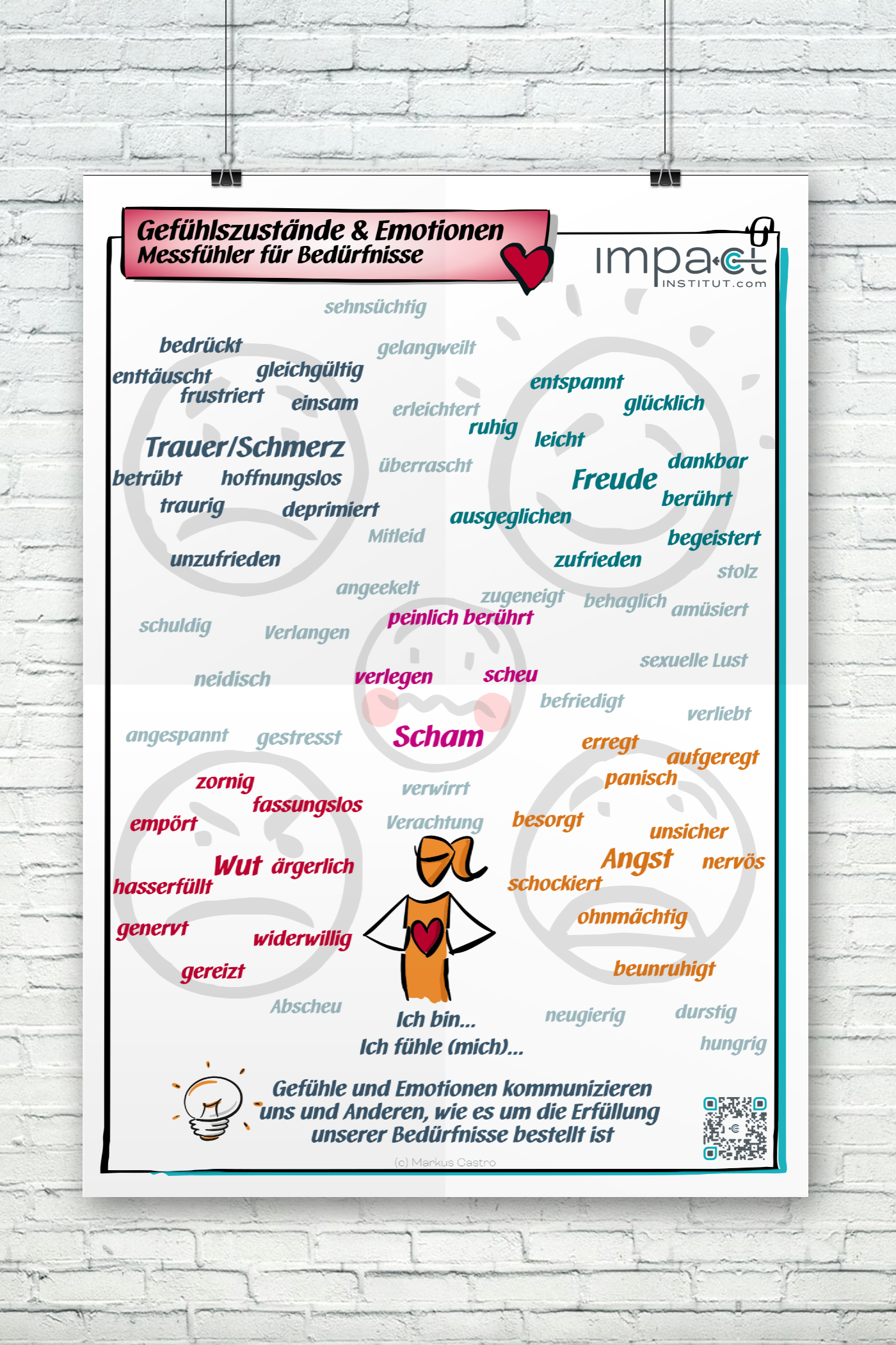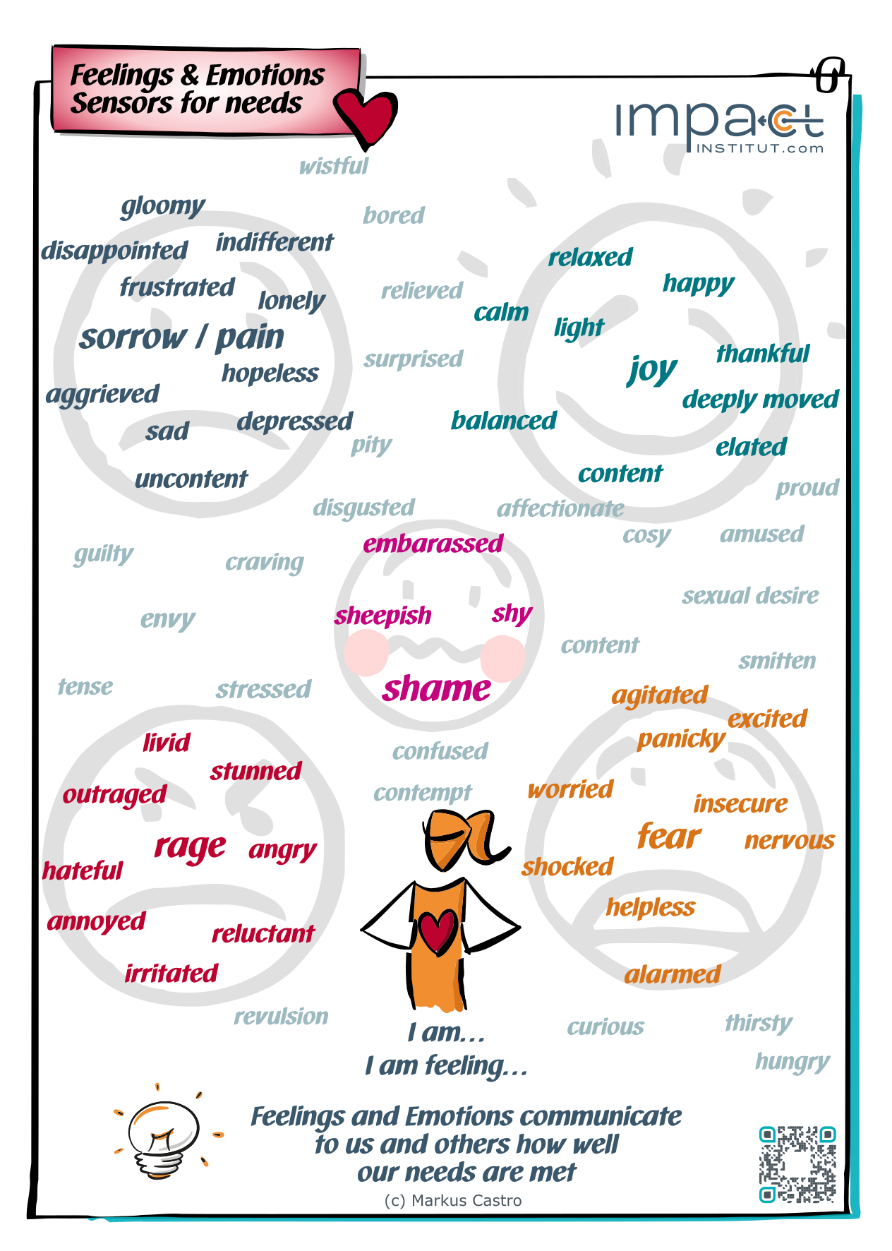 Emotionen sind nicht positiv oder negativ, deswegen gruppieren wir sie auf diesem Plakat anhand der fünf Basis-Gefühle: Freude, Trauer, Angst, Wut und Scham.